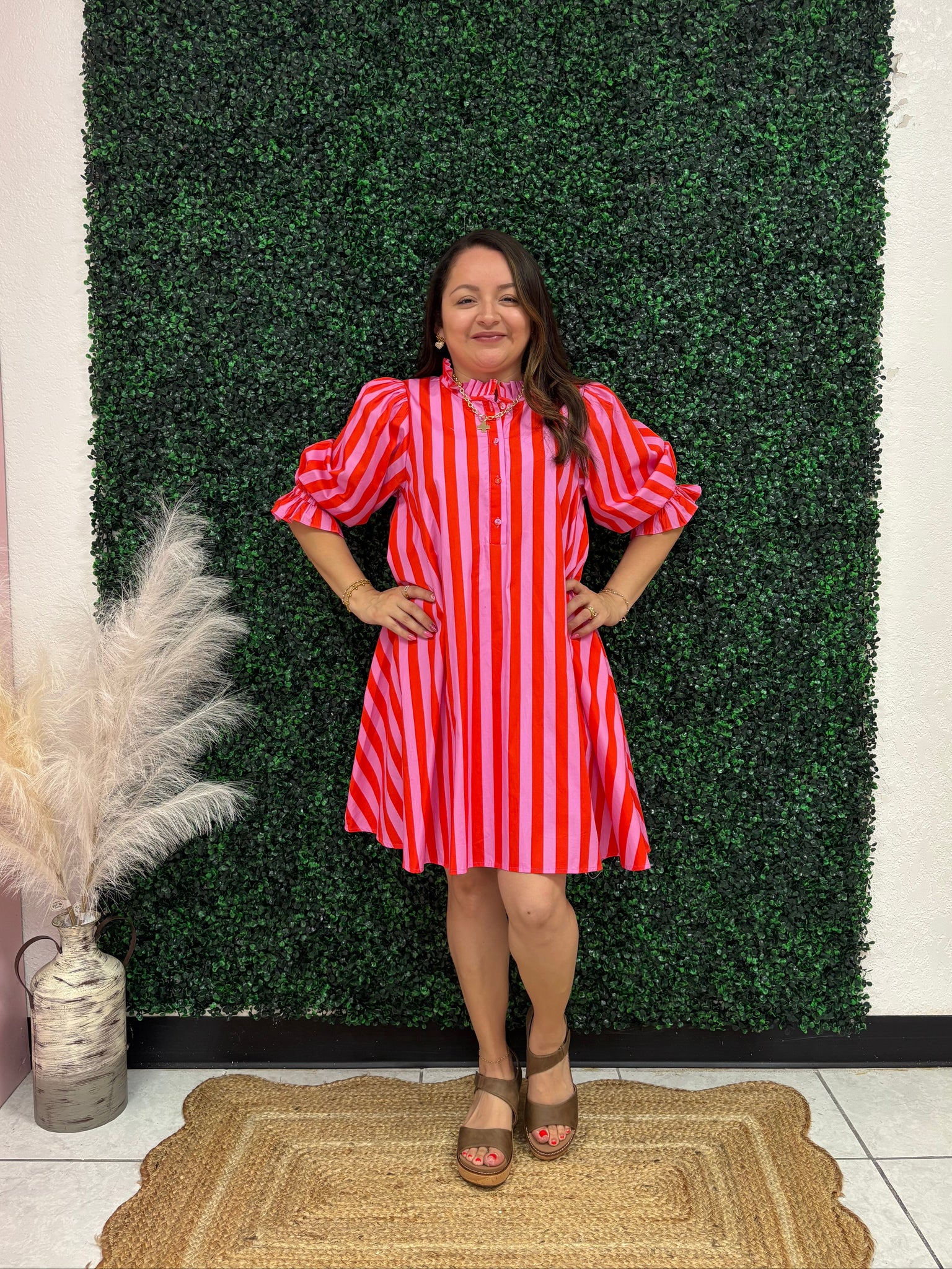 Elevate your wardrobe with the Ellie charming striped mini dress that effortlessly blends playful style with everyday wearability. The distinctive 3/4 puff sleeves and ruffled band collar create a flattering silhouette, while the partial button front and adjustable self-tie waist offer personalized fit and movement.